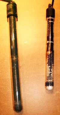 Hier zwei Stabheizungen sie haben einen Regler, an dem die erforderliche Gradzahl eingestellt werden kann. Sie sind mit einem Glaskolben ummantelt.